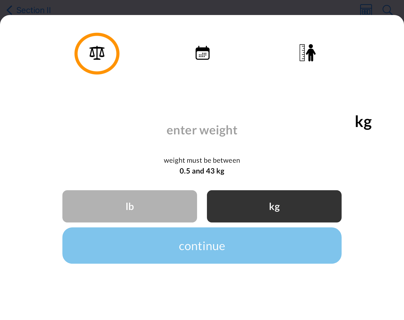You will first be asked to enter patient information. You can do this by entering the approximate weight, age, height, or using Pediatape or Broselow tape. You can also enter information for adult patients. Note: Pedi STAT defines an adult as any patient 44kg (97 lbs) and over.